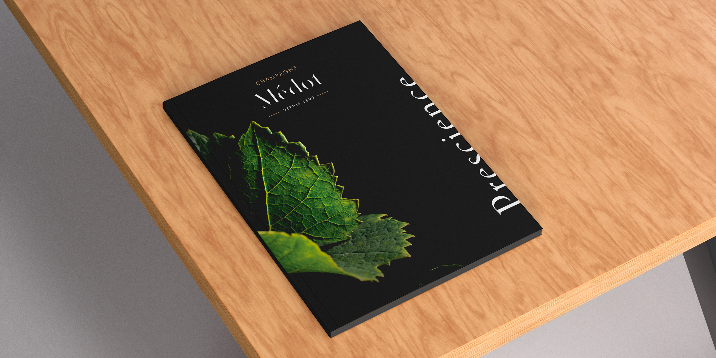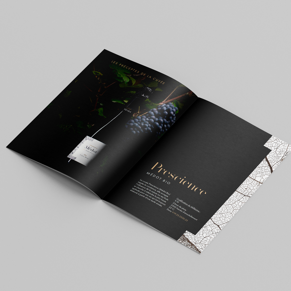 Réalisation de plaquette imprimée pour le Champagne Médot, marque développée par la maison de Champagne Lombard.
