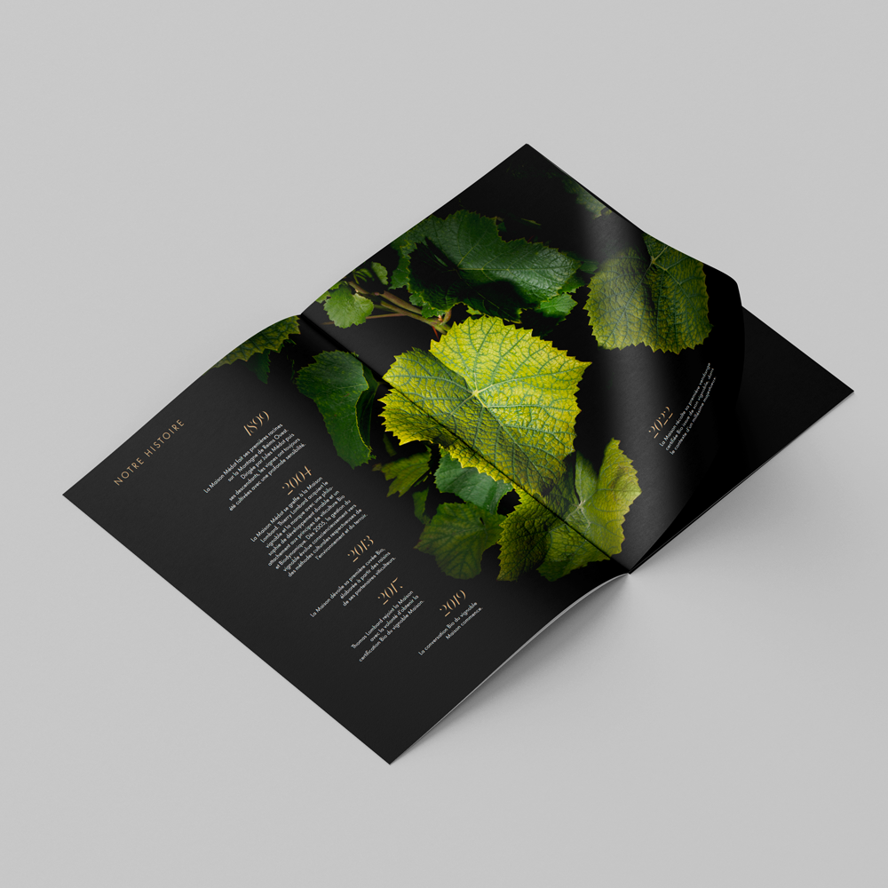 Réalisation de plaquette imprimée pour le Champagne Médot, marque développée par la maison de Champagne Lombard.