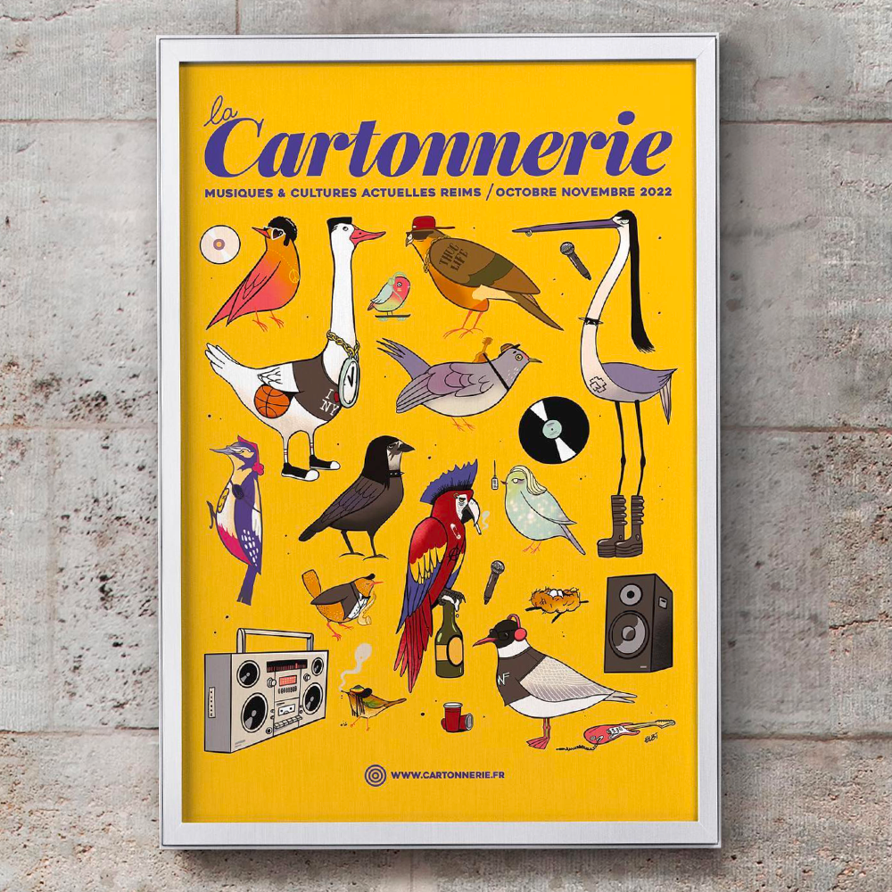 En 2022, nous avons réalisé la campagne visuelle de la nouvelle saison de la Cartonnerie, Scène des Musiques Actuelles de la ville de Reims. Illustrée par l'artiste ELBI, directeur artistique de la filière Heartwork (studio créatif de Retrokube), cette campagne reposait sur 3 visuels phares imaginés autour d'un bestiaire graphique de saison ainsi que de multiples éléments visuels permettant à la salle des déclinaisons pour chacune de leur programmation.